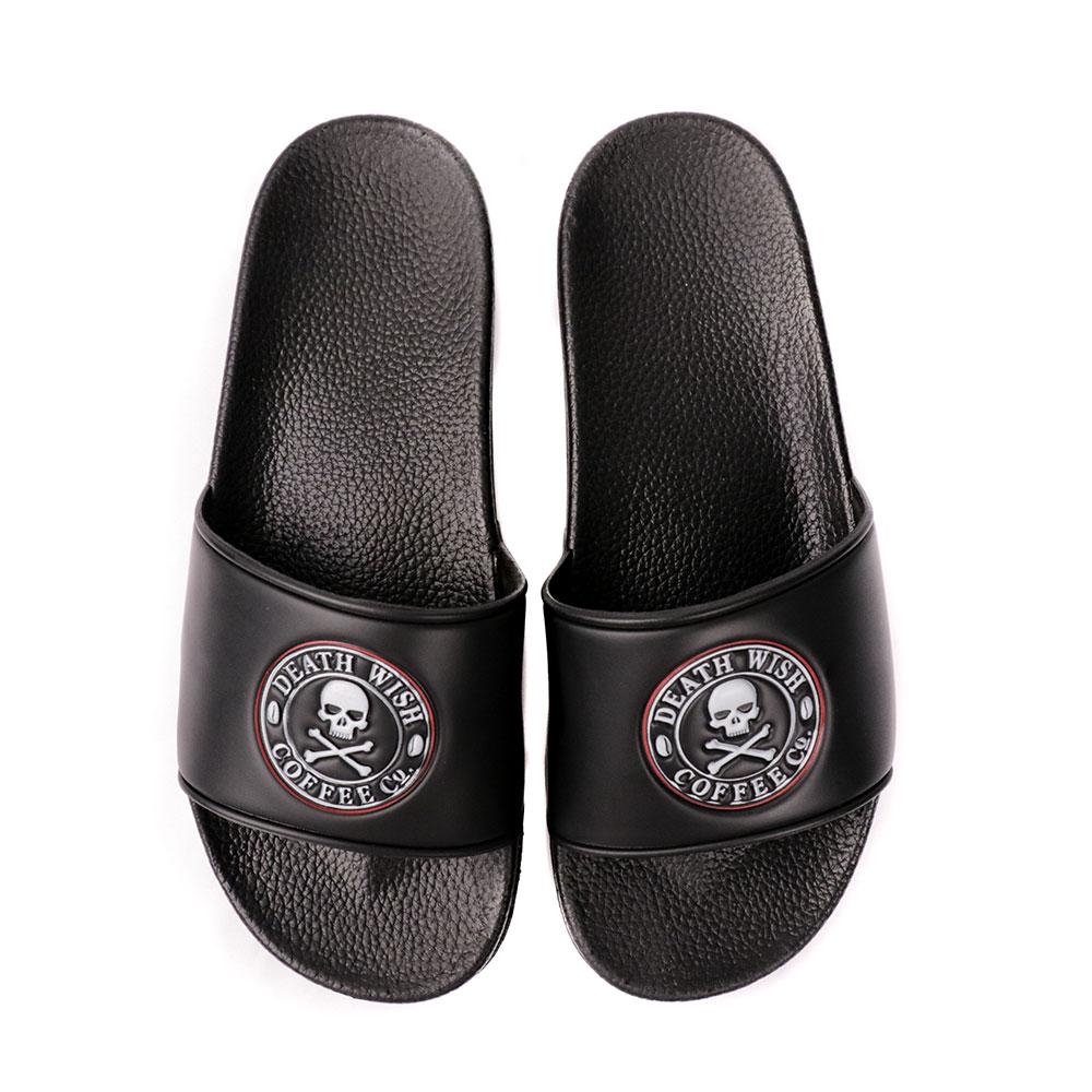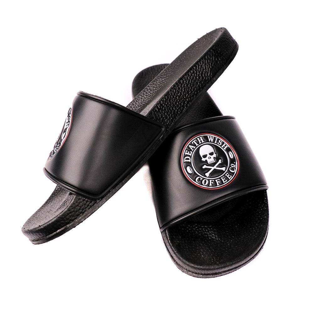 - Black slide sandals with a padded polyurethane single bandage strap with debossed Death Wish Coffee logo