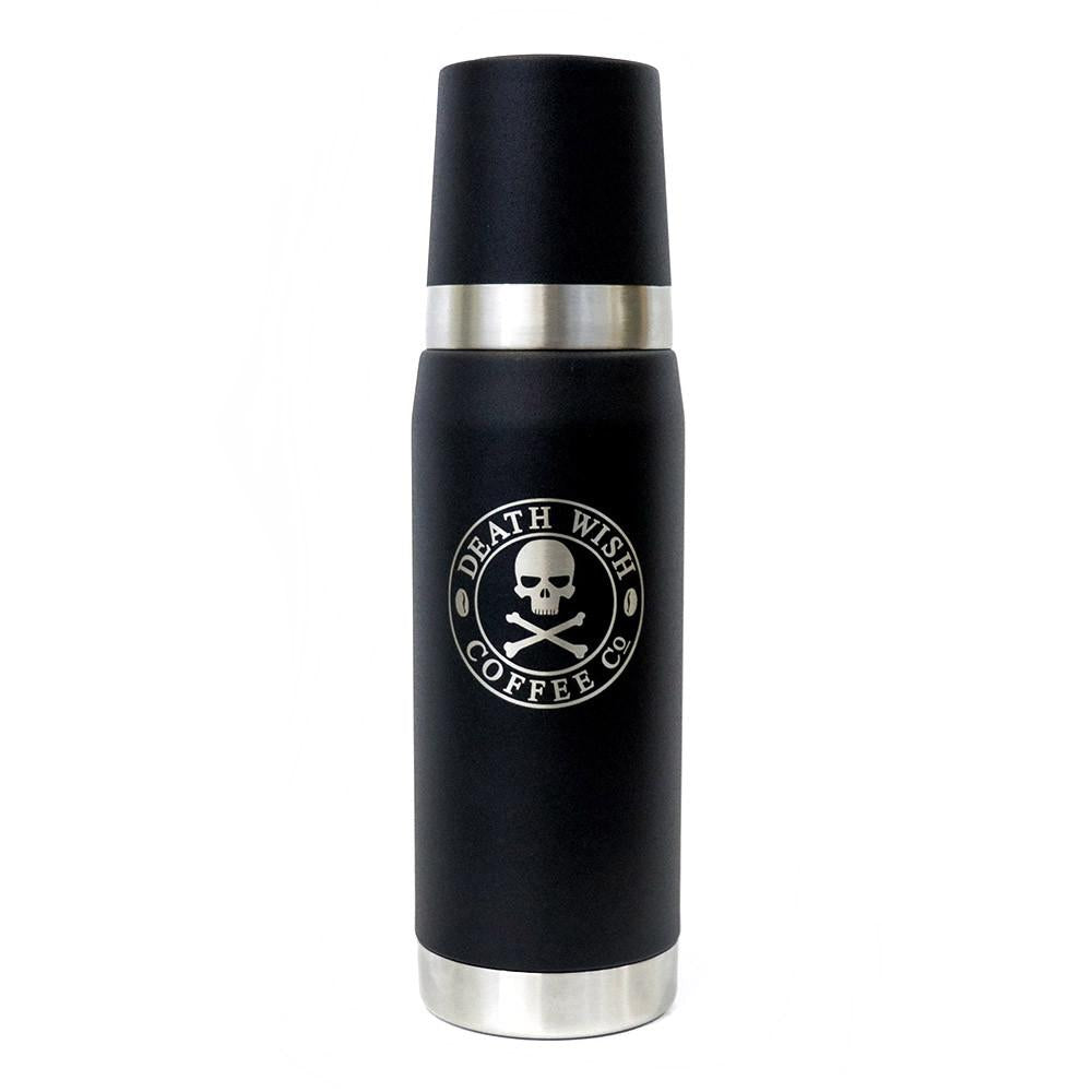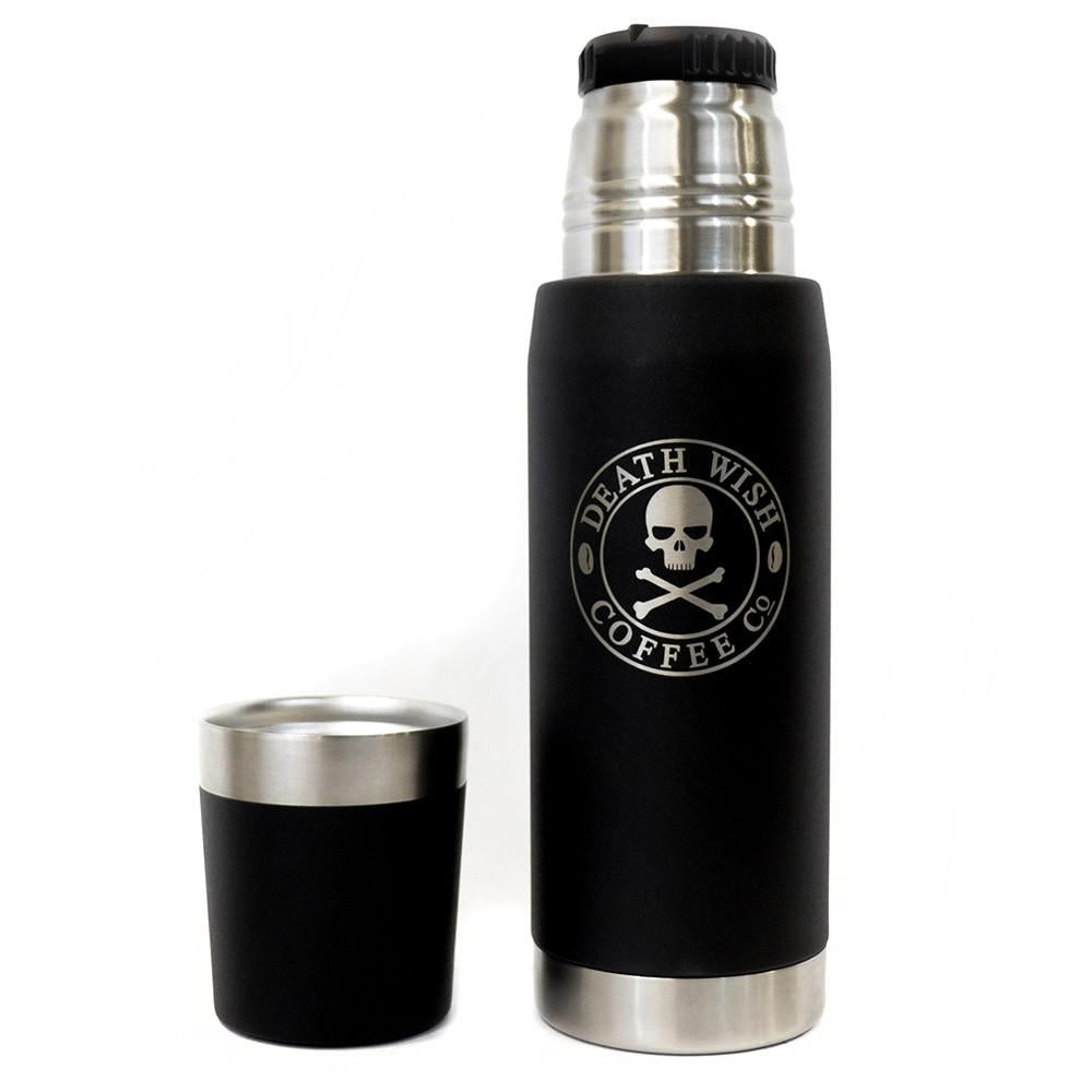 We set out to find a thermos that will last an entire workday. The all black Death Wish Coffee Stanley Thermos is a full 25 ounces and features our classic skull and crossbones logo in silver. The challenge is, how much coffee do you need?- 100% stainless steel